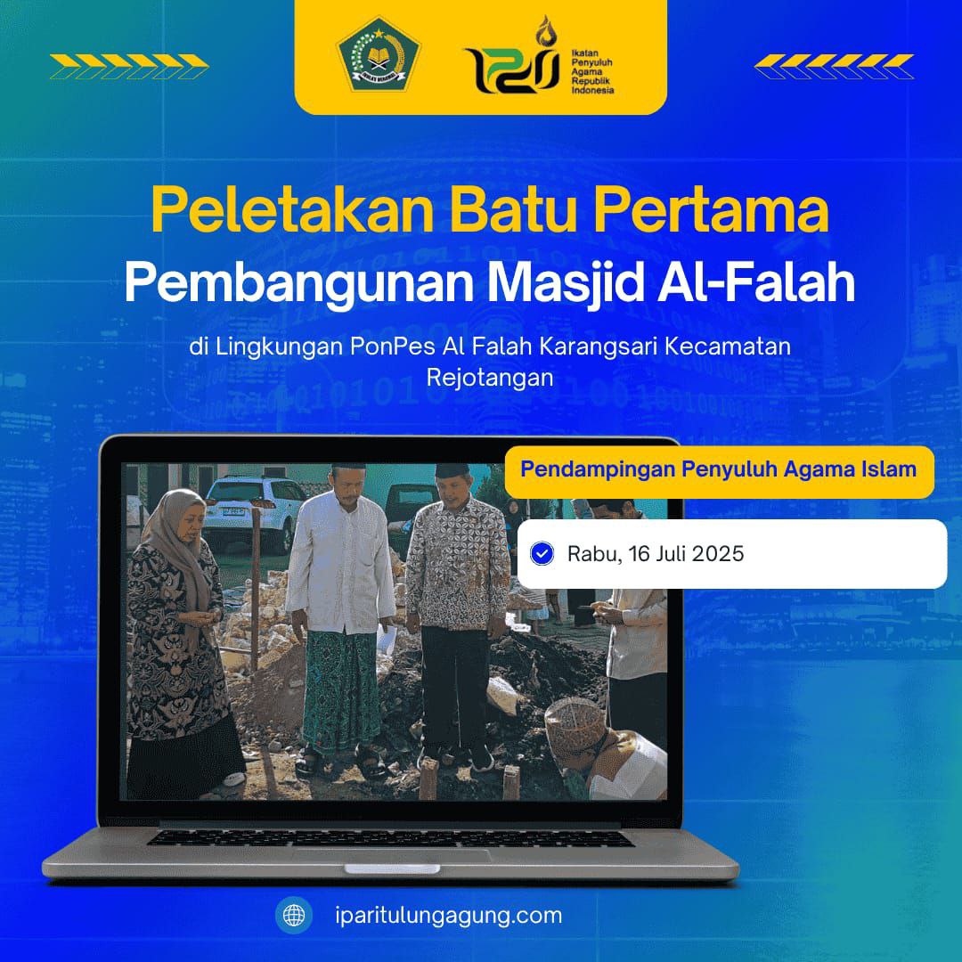 Pada hari ini Rabu, 16 Juli 2025 Penyuluh Agama Islam Kecamatan Rejotangan Kabupaten Tulungagung menghadiri peletakan batu pertama pembangunan masjid Al Falah di lingkungan Ponpes Al Falah Karangsari Kecamatan Rejotangan.