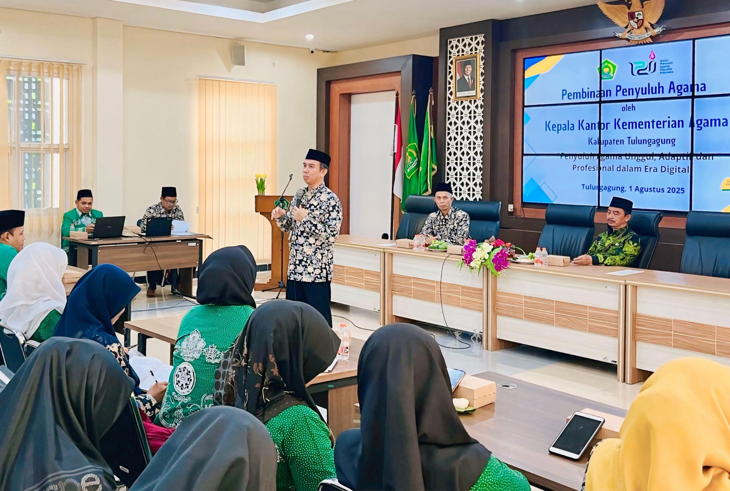 Tulungagung – Jum’at, 1 Agustus 2025 bertempat di Aula PLHUT Kementerian Agama Kabupaten Tulungagung dilaksanakan pembinaan Penyuluh Agama. Pembinaan diikuti oleh 104 Penyuluh Agama, baik dari Penyuluh Agama Islam maupun Penyuluh Agama Katholik.