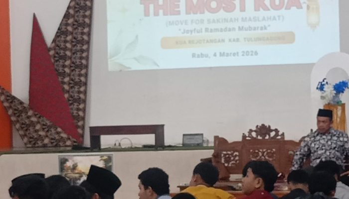 Rejotangan – Rabu, 4 Maret 2026 bertempat di Aula SMKN 1 Rejotangan Tulungagung dilaksanakan The MOST (Move for Sakinah Maslahat), sebuah program inisiatif Kementerian Agama RI untuk meningkatkan kemaslahatan keluarga. Acara diikuti oleh kurang lebih 250 orang peserta, siswa-siswa kelas 11 SMKN 1 Rejotangan dari berbagai jurusan baik laki-laki maupun perempuan.