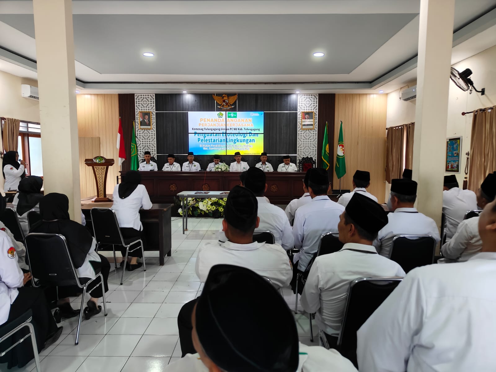 Kegiatan ini diawali dengan penandatanganan Nota Kesepahaman (MoU) antara Kepala Kantor Kementerian Agama Kabupaten Tulungagung, H. Mohamad Afif Fauzi, S.Ag., M.Pd.I., dengan Ketua Tanfidziah Pengurus Cabang Nahdlatul Ulama (PCNU) Tulungagung, Dr. Bagus Ahmadi, M.Sy., M.Pd.I.dan jajarannya Wildan sebagai pengelola Hutan Walikukun. Penandatanganan berlangsung di Kantor Kementerian Agama Kabupaten Tulungagung pada Senin (27/4/2026).